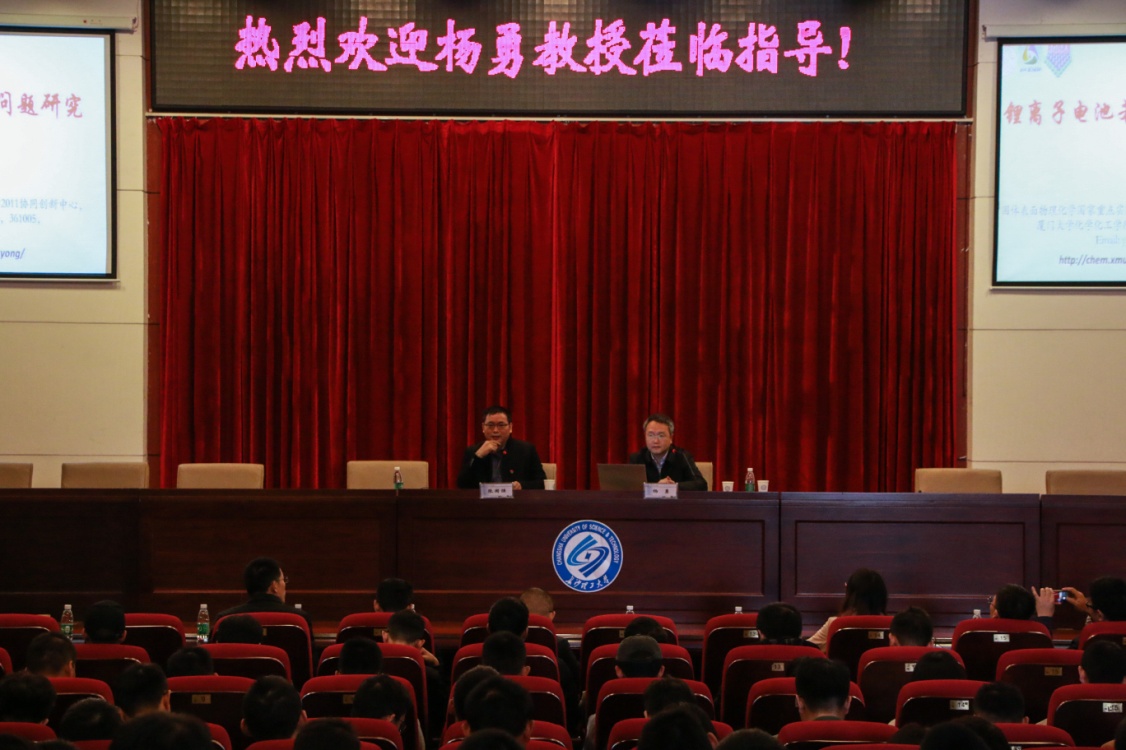 讲座开始,张国强书记代表材料学院对杨勇教授的到来表示热烈欢迎,并简单介绍了杨勇教授的基本情况。杨勇教授曾荣获中国化学会电化学贡献奖,国际电池材料协会技术成就奖,亦是国家杰出青年科学基金获得者,人事部新世纪百千万人才工程“国家级人选”,并荣获国务院政府特殊津贴,现担任国际知名电池杂志J. Power Sources (IF=6.93)主编,国际电池材料学会理事会理事,国际锂电池会议执委会委员与特种化学电源国家重点实验室学术委员会委员等学术兼职,同时长期担任国家军用电池专家组的专家。杨勇教授对多种新型锂/钠离子电池材料的合成、结构、表面修饰及其电化学性能进行深入系统研究,同时建立并运用多种原位电化学谱学技术(如电化学微分质谱、电化学同步辐射联用技术和固体核磁共振谱)对相关电极过程开展创新性研究。