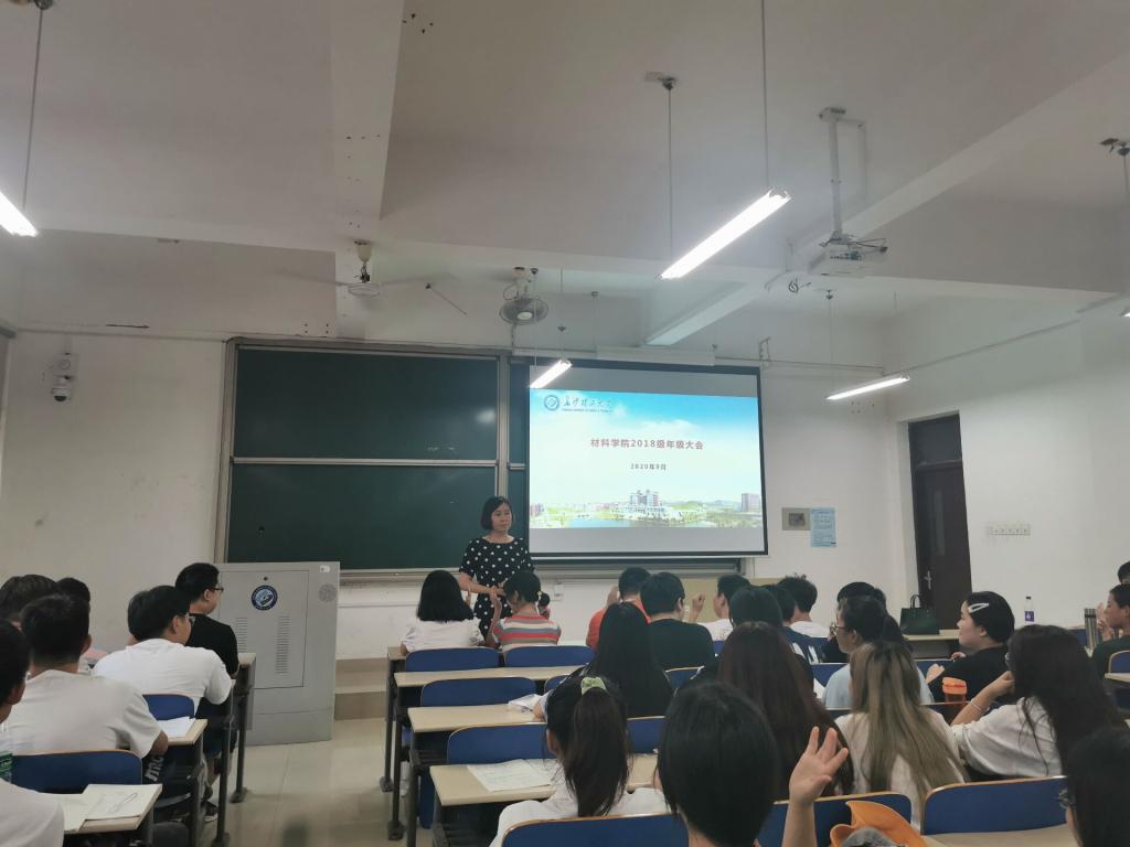 9月8日晚上材料学院在工一A212召开18级年级大会,年级辅导员谢易真主持会议,学院党总支副书记陈华,18级全体学生参会。