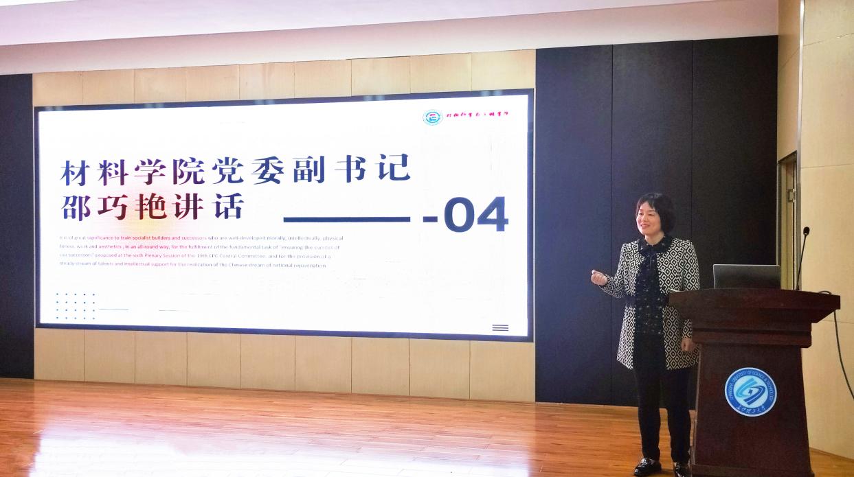 邵巧艳希望材料学子向优秀看齐、向榜样学习,要不忘初心、牢记使命,用爱党爱国爱家的实际行动去修身齐家、治国平天下;要勇于奋斗、追求卓越,明确目标,严格自律,持之以恒,有力量的前行;要敢于担当、践行使命,在创新实践、团队协作与服务奉献中成为更优秀的自己,让青春在奋斗中闪光。