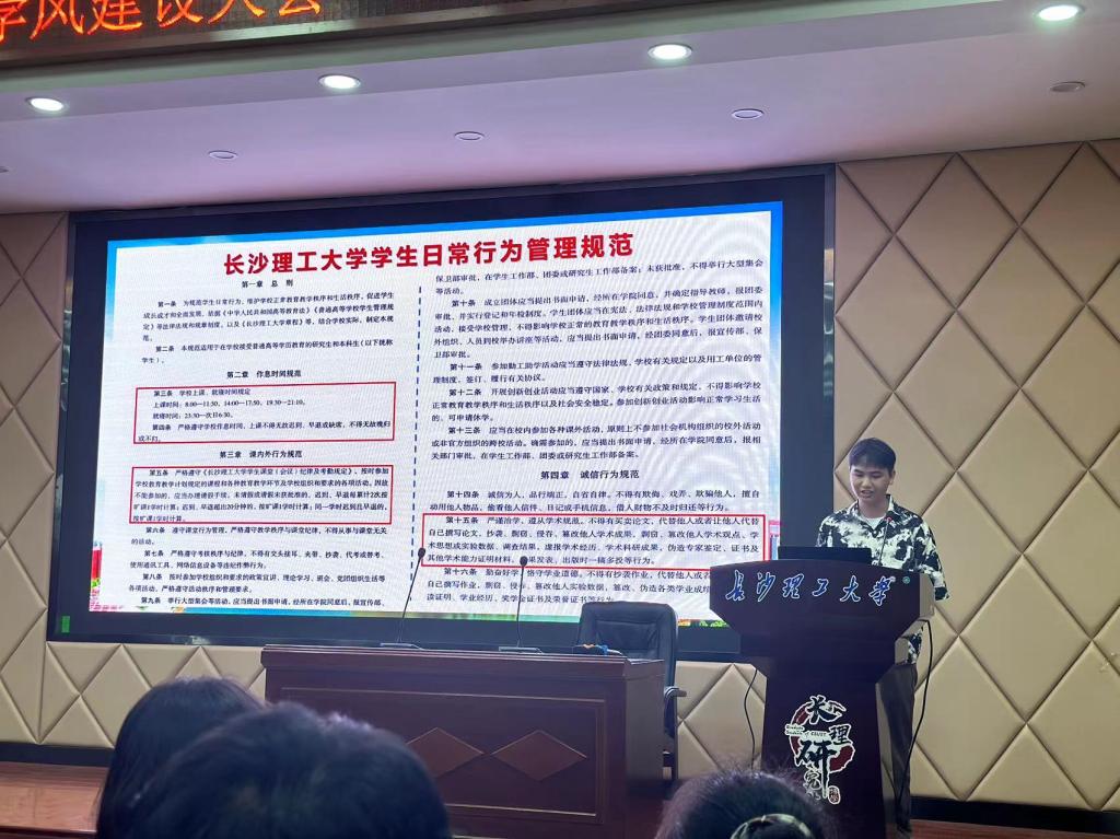 会议最后,邵巧艳对学院学风建设的整体情况进行了总结,她肯定了如今取得的成绩,又指出了学院学风建设方面还存在的不足,围绕继承优良传统和涵养优良学风两个方面,分享了湖湘精神和长理精神,呼吁同学们能不断奋发图强、刻苦钻研、注重实践,树立正确的学习观念和价值导向,提高自身综合素质,一同加强学院的学风建设,共同为建设研究型学院添砖加瓦。