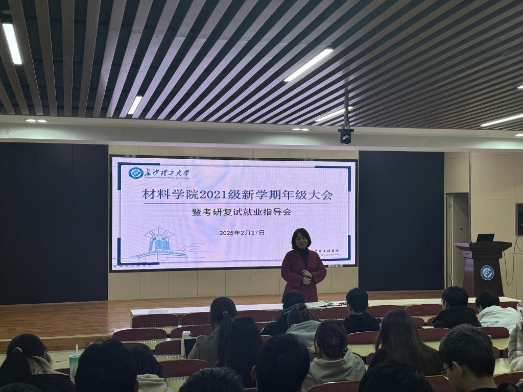 2月27日晚,材料科学与工程学院2021级本科生年级大会在云塘校区工科三号楼A201报告厅举行。学院党委副书记邵巧艳、就业辅导员谢易真、年级辅导员王志亮出席会议,全体2021级本科生参会。本次大会以"规划学业发展,导航职业未来"为主题,通过学情分析、考研指导、就业规划等专题内容,为同学们提供全方位的学业发展指导。