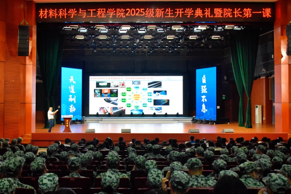 2025年9月23日14:30,材料科学与工程学院2025级新生开学典礼暨院长第一课在云塘校区大礼堂举办。院长毛卫国、院党委书记郑延恒、特邀党建组织员刘兴旺、副院长谢炜,86级硅酸盐1班优秀校友、岳阳市昱华玻璃制品有限公司董事总经理、工程师肖轩,岳阳市昱华玻璃制品有限公司副总经理孔志全出席,学院各系教师代表、2025级新生班主任和全体辅导员与500余名学生参加。活动由学院党委副书记邵巧艳主持。