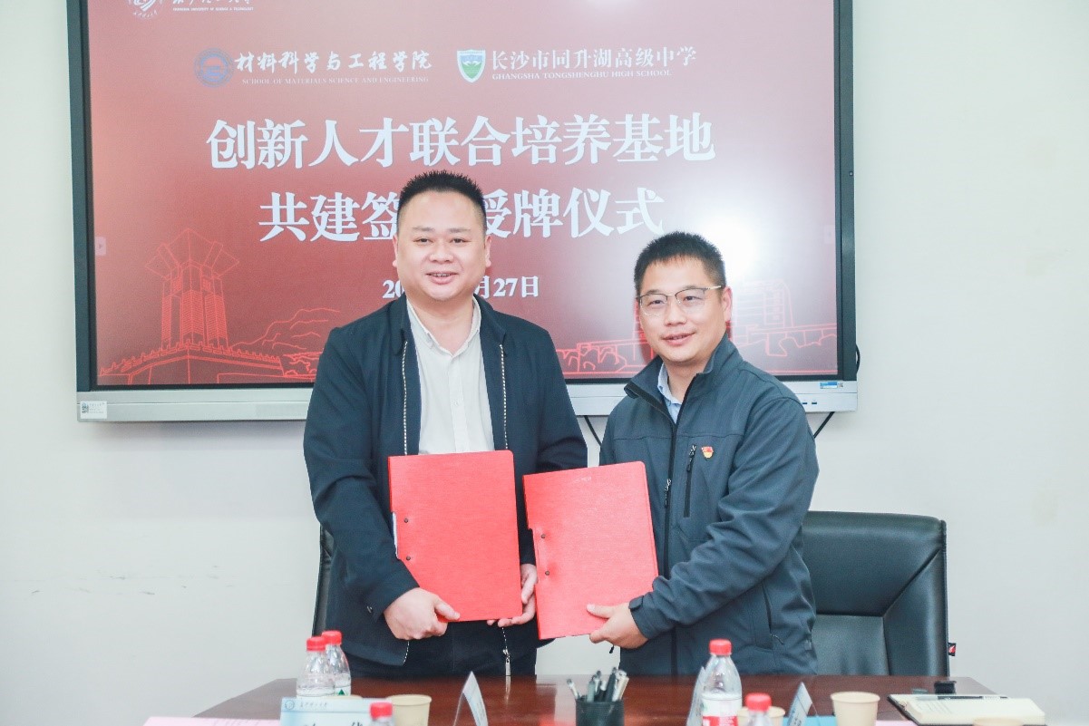 随后,毛卫国、向赞勋代表双方签署“创新人才联合培养基地”共建协议。毛卫国代表云顶国际vip8866材料科学与工程学院向长沙市同升湖高级中学授牌。双方就加强人才培养输送、深化重点学科教学合作、合力共建创新实践平台等方面进行了深入交流,进一步达成了合作共识。