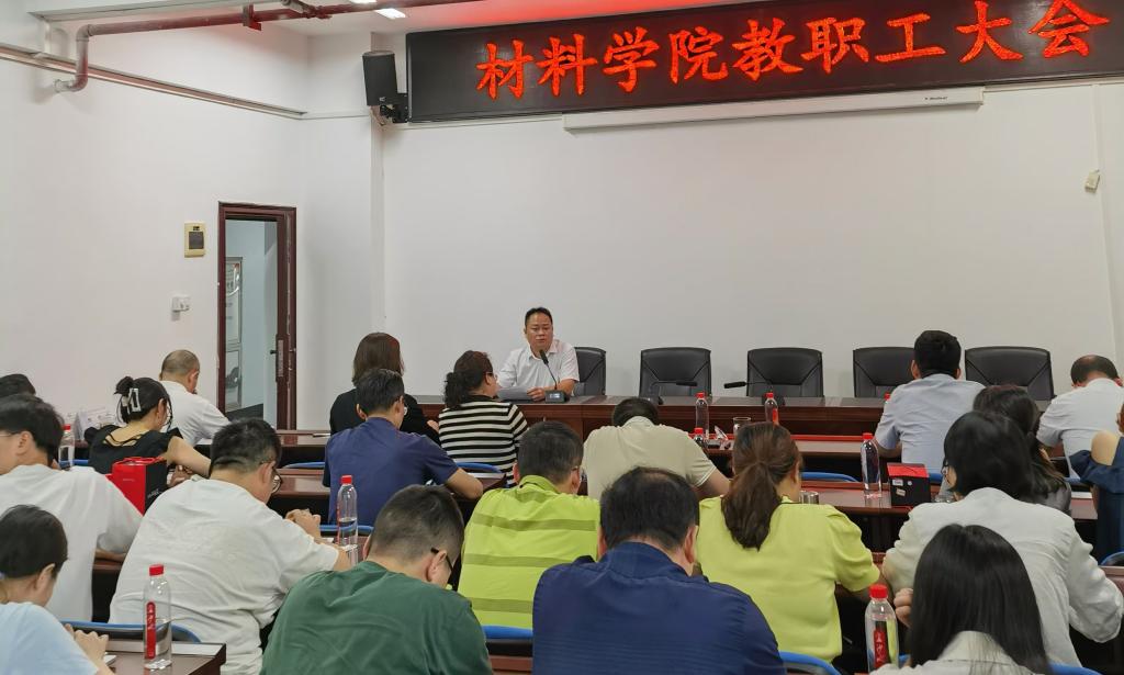9月11日下午,材料学院在新能源大楼1-908会议室召开全体教职工大会,全面总结了暑期工作,并对下一阶段的教学、科研等重点工作进行了详细部署。党委书记郑延恒、院长毛卫国等全体院领导、全体教职工参会,会议由党委副书记邵巧艳主持。
