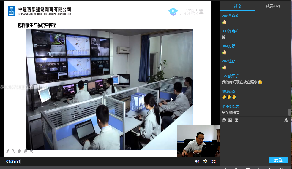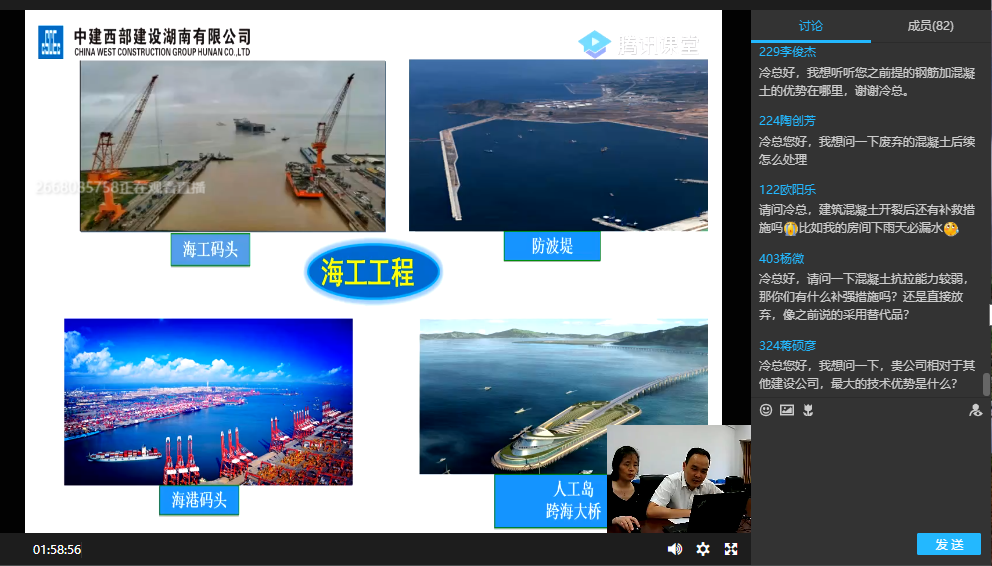 讲座中,冷经理从预拌商品混凝土的质量控制出发,用图片为同学们展示并分析讲解了混凝土原材料、混凝土基本性质、混凝土绿色环保搅拌站、混凝土性能检测、混凝土运输和泵送设备等内容,对新型混凝土的制备机理进行了详细讲述。在互动环节,同学们争先提问,冷经理认真地回答了同学们在专业上的问题,并对学生们在就业定位,岗位选择等方面给出方向性意见。在线上课堂的轻松氛围中,学生们很好地发挥自身聪明才智,在评论区相互帮助,集思广益,对问题的展开探究更加深入,对自身未来的规划更为明确。