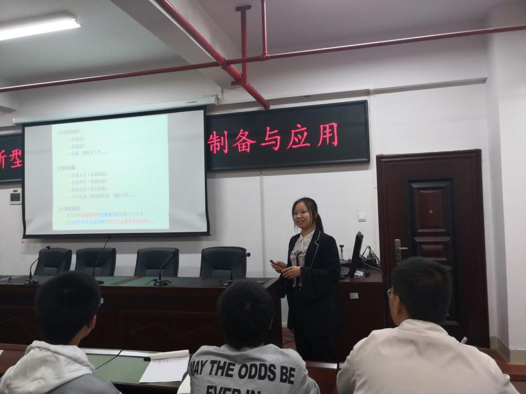首先钟老师讲述了自己的求学经历到取得科研成就的过程,随后她抛出问题“你们来大学的目的是什么?”,从介绍大学的主要职能出发,告诉同学们上大学的真正目的应是:成为具有创新精神和实践能力的高级专门人才以及德智体美全面发展的社会主义建设者和接班人。钟老师介绍了染料——光敏燃料——三重态光敏染料的概念,通过光动力治疗、TTA上转换、光解水制氢三方面对新型三重态光敏染料研究进展进行总结。钟老师同时提到了过渡金属配合物光敏剂的优点:ISC效率高、光稳定性好、结构易修饰以及传统过渡金属配合物光敏剂的缺点:吸收谱带窄、在可见区吸收弱----降低了太阳光等自然光能利用率。钟老师讲解专业知识时是层层递进,图文结合的,让生涩的专业知识简单又有内涵。最后钟教授向同学们展示了自己的科研成果,希望同学们确定自己的方向,为梦想奋斗,成为一个具有创新、精神、实践能力的合格大学生。讲座结束后,同学们针对不懂的问题积极地进行了提问,钟老师也耐心地为他们解答。