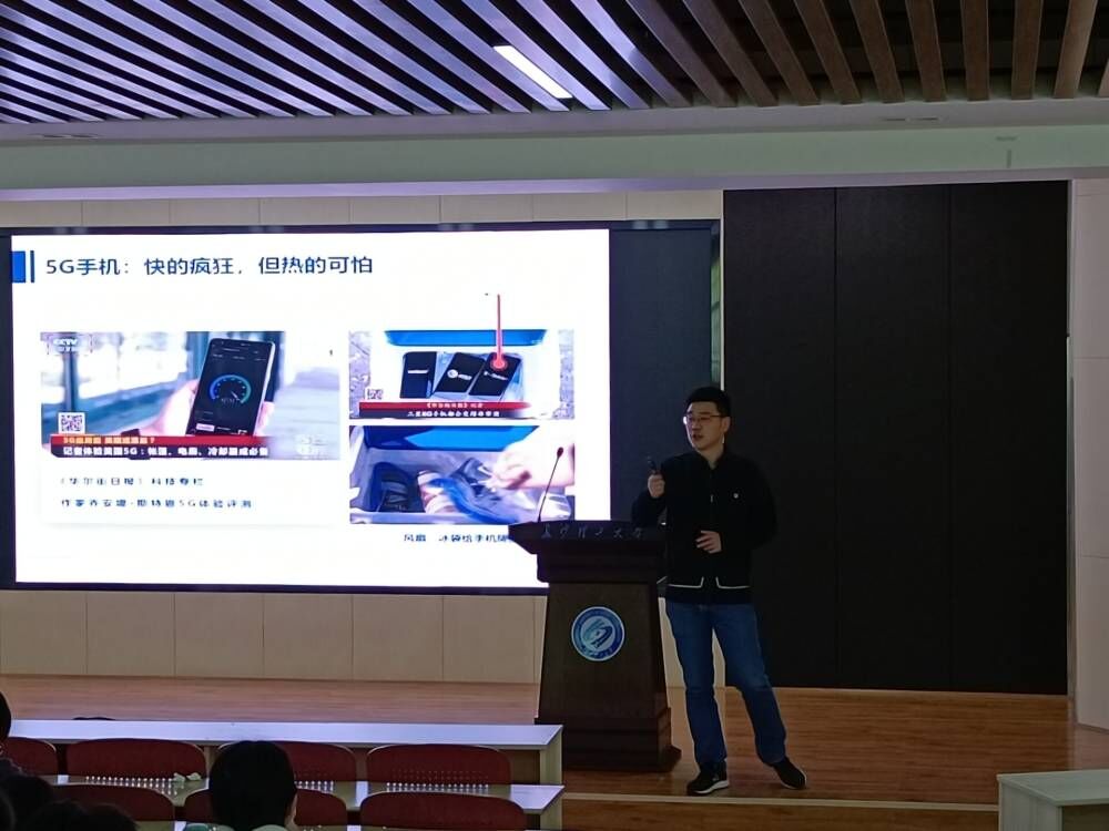 讲座开始,张龙从项目背景、核心技术及应用前景等方面,对新型高导热复合相变材料进行了具体地介绍,并通过各类用户的体验,形象地说明了手机散热等设备性能问题是当今关注的热点。而后,张龙从电子设备故障的主要原因出发,详细介绍了行业高度关注的难点以及热点。接着,张龙介绍自己项目团队制作的材料相比市场上其他材料的竞争优势以及三大核心技术,强调了材料热导率相比基体提高92倍,热导率及效率高于其他实验室产品五倍以上。最后,张龙向全体学生介绍了自己项目的成员,以及标志性成果,同时展现了项目的目标及期望。