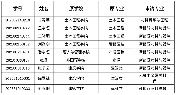 根据学校《关于做好2023级在校本科生转专业(类)工作的通知》(教通字[2024]9号)和《材料科学与工程学院2024年本科生转专业工作细则和实施方案》的相关规定,经学生个人申请,学院初审,现将本院2023级本科生转专业初审合格名单进行公示,公示期3月23日-3月25日。如有疑问,可在公示期内向材料科学与工程学院教务办反映。电话:85258487;联系人:李老师,电子邮箱:851187698@qq.com
