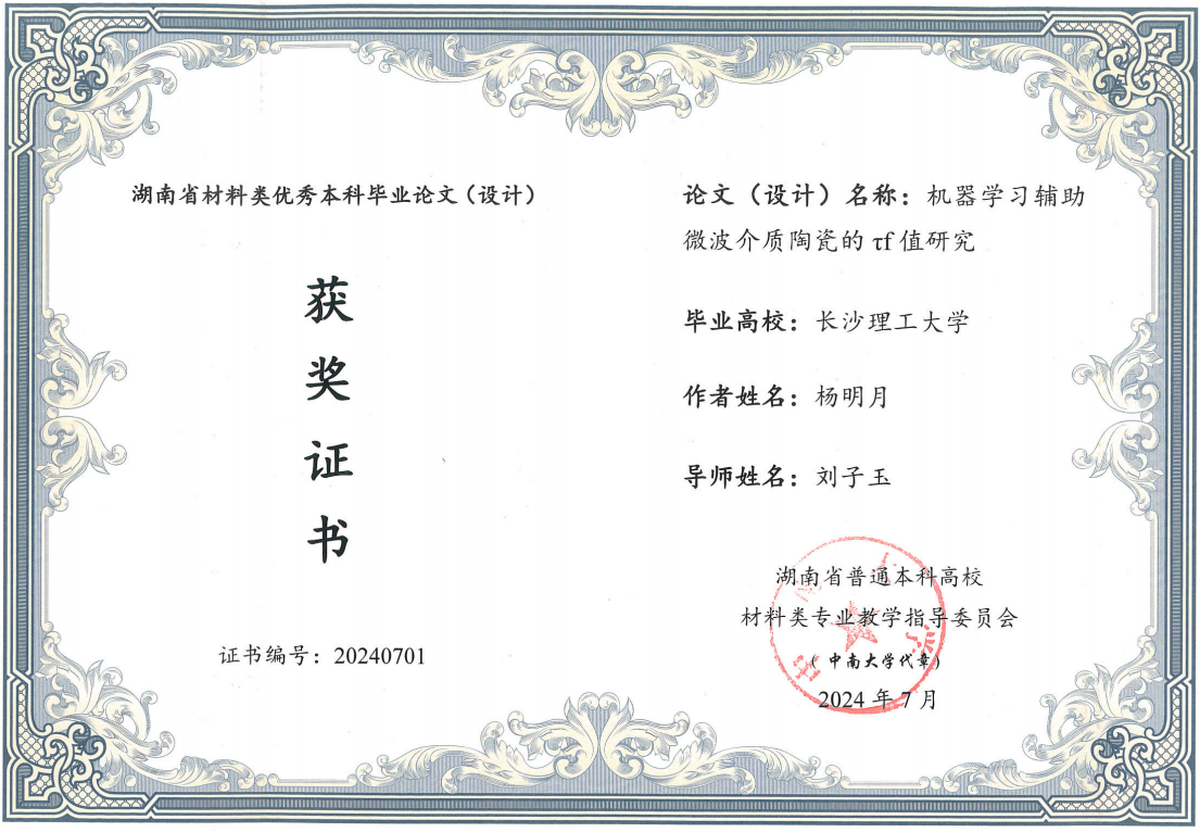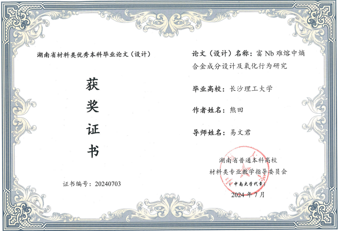经过学院老师的辛勤付出,2024年我院本科生毕业论文答辩工作取得圆满成功,127名本科毕业生通过毕业论文答辩顺利毕业。在此次湖南省材料类优秀本科毕业论文评选中,我院取得了不错的成绩,其中周敏政、同景天、王宇翔、丁蔚、杨明月、熊田等6位学生获得湖南省材料类优秀本科毕业论文。希望我院师生共同努力,在未来取得更好佳绩。