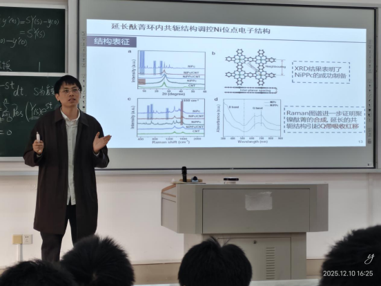 为拓展知识,拓宽视野,提高学生素质能力,促进学生综合发展,2025年12月10日下午,云顶国际vip8866陈克军博士在云塘校区面向2025级新能源材料与器件专业师生作题为“镍/铁酞菁结构调控及其电催化性能研究”的学术讲座。讲座围绕“双碳”背景,介绍了新能源材料前沿进展。