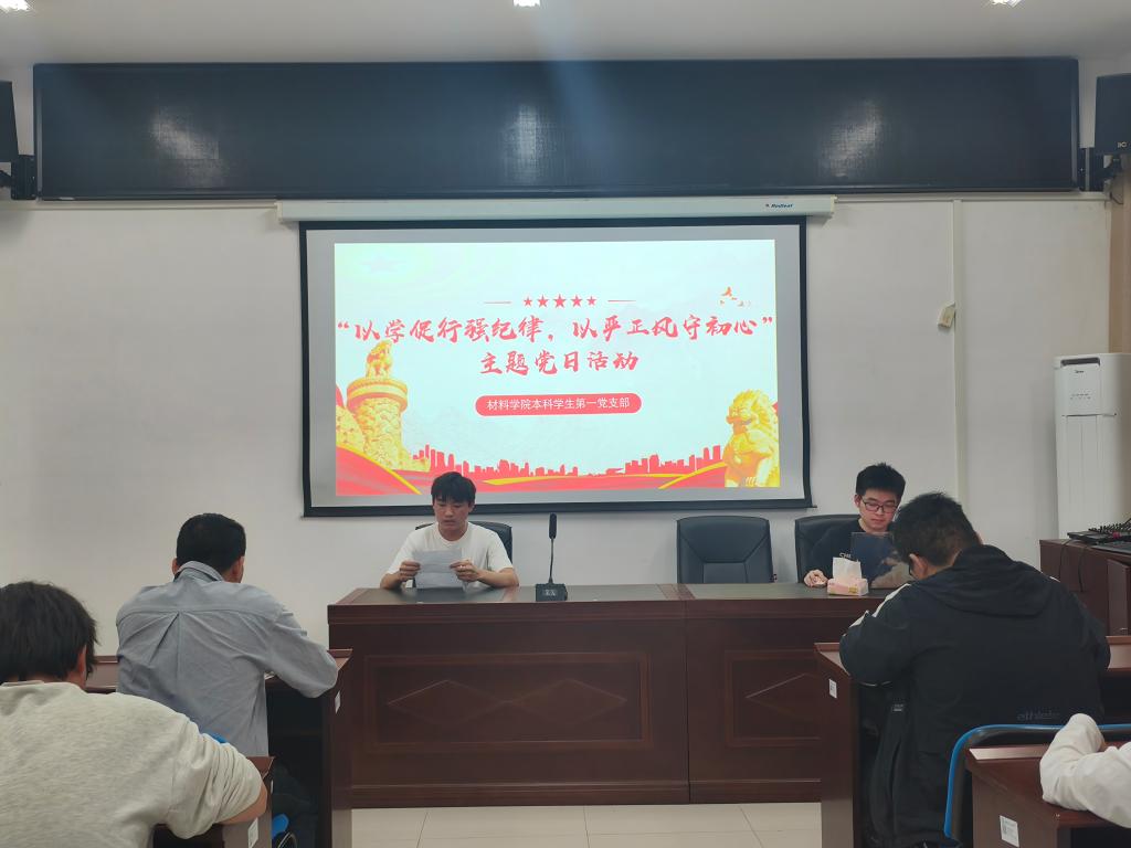 4月16日晚19:00,材料科学与工程学院本科学生第一党支部于新能源1号楼908室开展“以学促行强纪律,以严正风守初心”主题党日活动。本次活动旨在进一步强化学生党员纪律意识,提升党性修养。活动由党员崔哲主持。