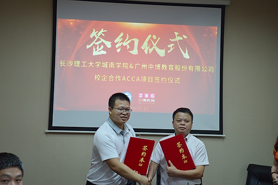 7月19日下午,城南学院与中博教育股份有限公司在金盆岭二教202举行ACCA项目合作办学签约仪式。中博教育副总裁罗永君、校企合作部湖北省开发总监杜红兵、湖南分公司总经理肖承冠以及城南学院全体班子成员出席了签约仪式。副院长向永生主持签约。