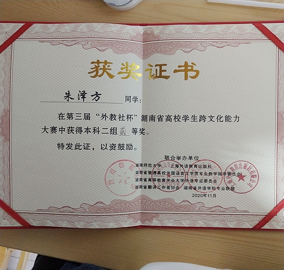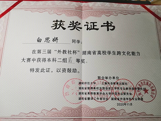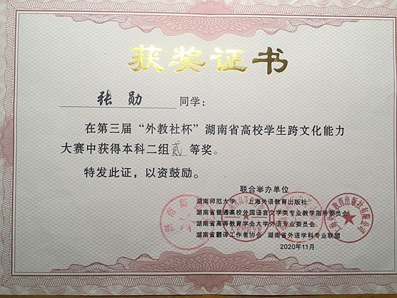 11月22日,第三届湖南省高校学生跨文化能力大赛在湖南师范大学落幕,来自全省43所高校的选手参赛角逐。城南学院法学1901班白思妍、英语1901班朱泽方和法学1802班张勋组成的云顶国际vip8866城南学院代表队,经过学校初赛选拔、省复赛及决赛的激烈角逐,从案例展示与分析、文化知识问答、视频情境评述和讲述中国文化故事等方面,用跨文化视角展现他们的所思所想,创新形式广受好评,最终获得本科二组二等奖。