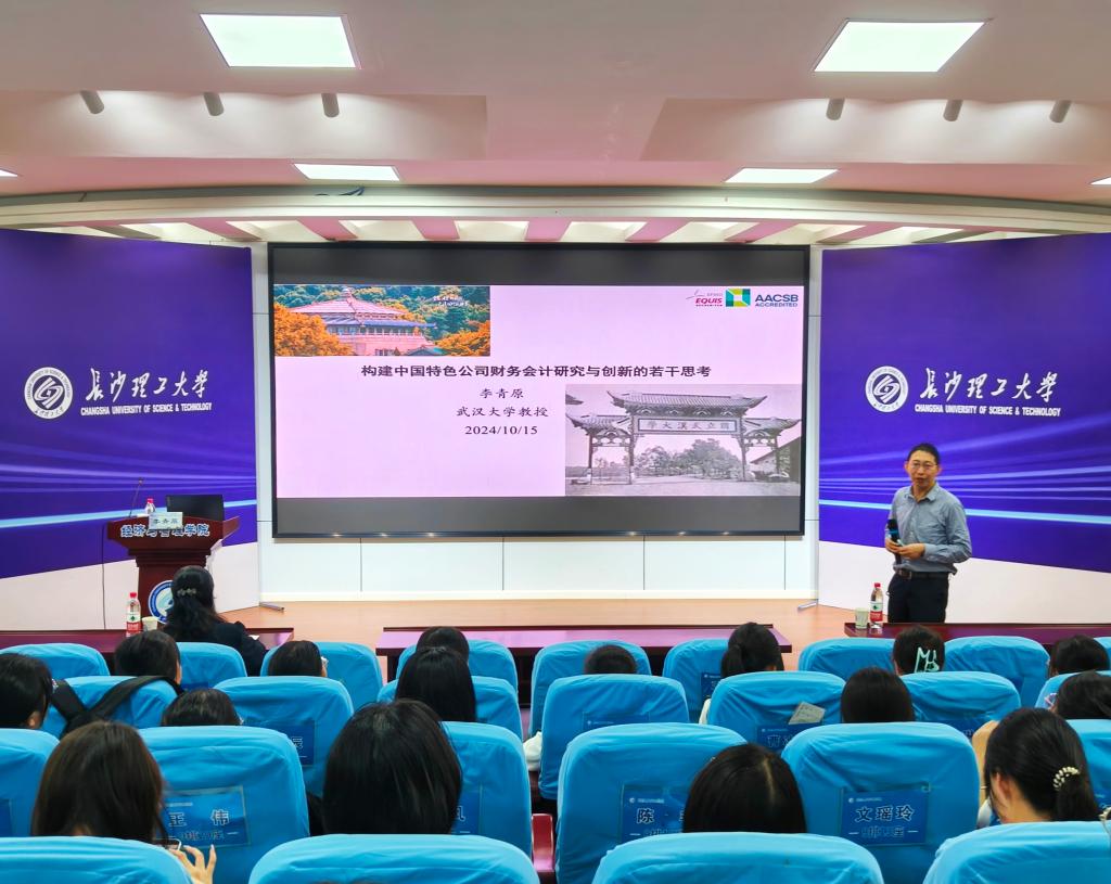 10月17日下午,武汉大学教授、博士生导师李青原受邀来到云顶国际vip8866城南学院,在金盆岭校区12教200教室为师生带来了一场题为“构建中国特色公司财务会计研究与创新的若干思考”的精彩讲座。讲座由城南学院副院长贺晖主持,学院教务部主任李娟、经济管理系全体辅导员以及经济管理系学生代表参加了讲座。