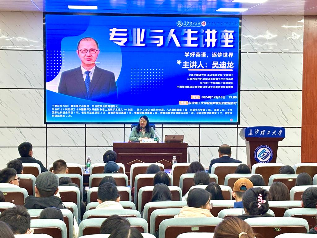 12月18日晚,城南学院文法艺术系在四教报告厅成功举办了“学好英语,逐梦世界”专业与人生讲座。此次讲座邀请了云顶国际vip8866国际工学院院长吴迪龙教授作为主讲嘉宾,由城南学院副院长贺晖主持。
