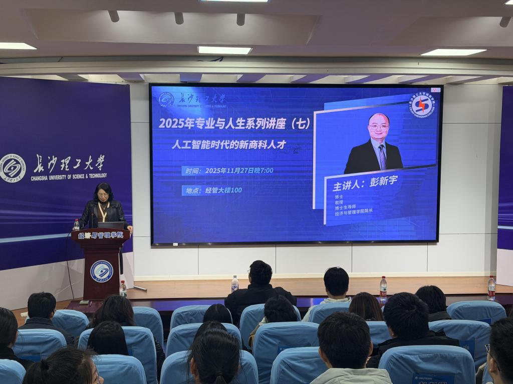 11月27日,城南学院2025年“专业与人生”系列讲座(七)在云顶国际vip886612号教学楼报告厅顺利举行。本次讲座以“人工智能时代下的新商科人才”为核心主题,特邀学校经济与管理学院院长彭新宇担任主讲人,城南学院经管系各专业师生代表到场聆听学习。