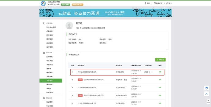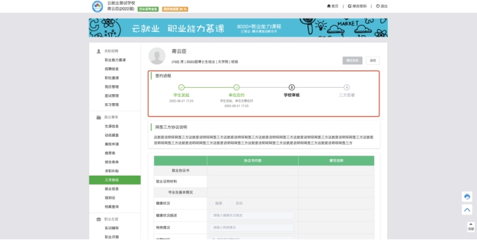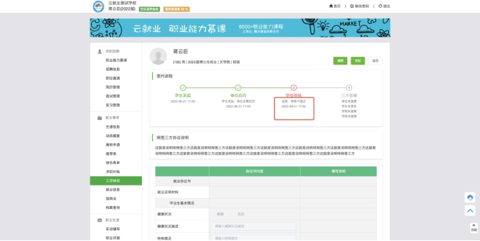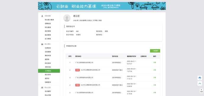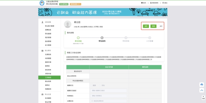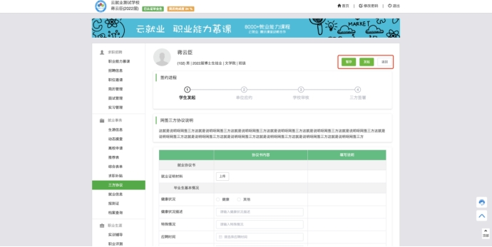 a)学生可以在【就业网】-【三方协议书】-【申请违约】,申请之后由老师审核,审核通过后,学生可发起新签;