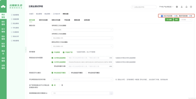 3)腾讯电子签以三方协议签署成功记录计费(即三方都完成签署计一次),可在【参数设置】中查看总份数、剩余份数;