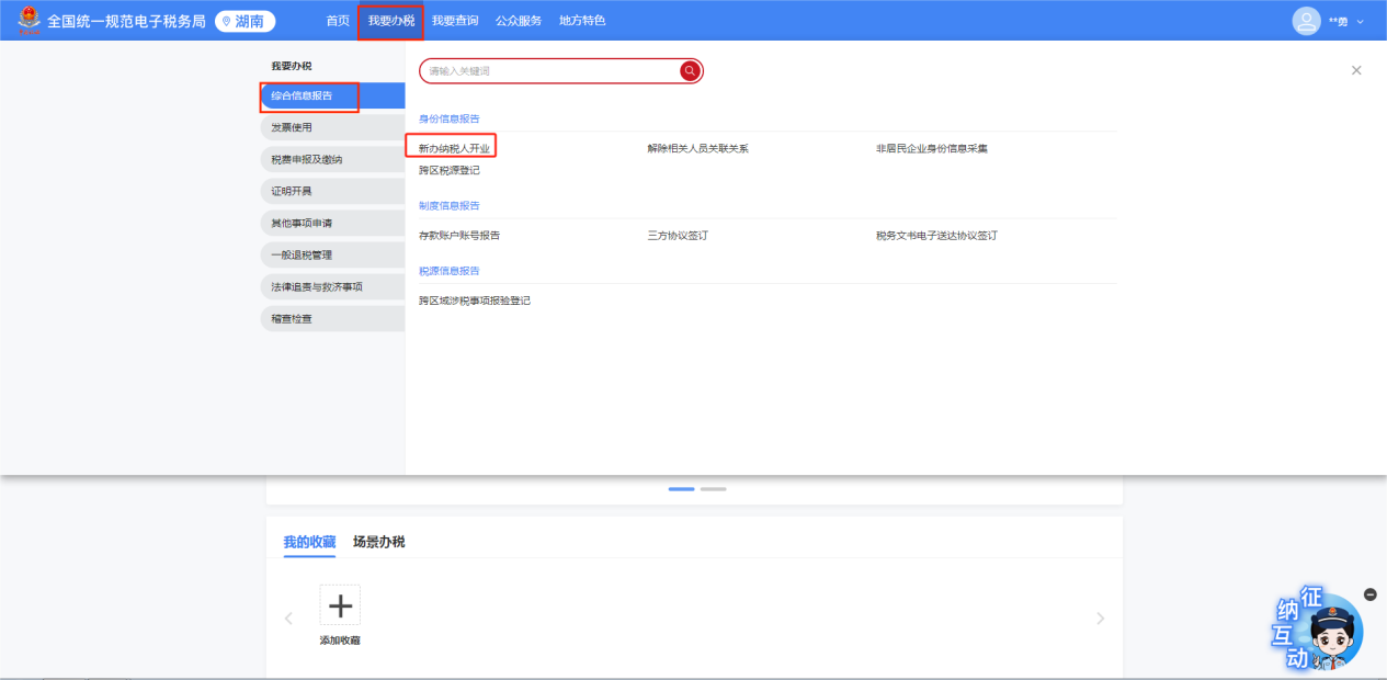 通过电子税务局【自然人业务】入口登录个人账号后,点击【我要办税】-【综合信息报告】-【身份信息报告】-【新办纳税人开业】,也可在右上角搜索框直接搜索关键词进入办理页面。