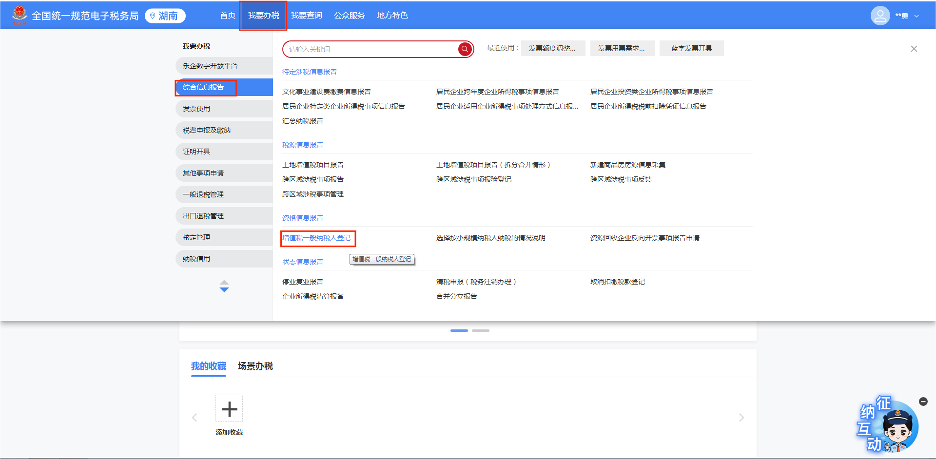 操作指引:新办纳税人在电子税务局一般初始判定为小规模纳税人,如果有需要转成一般纳税人的,可进入电子税务局首页,点击【我要办税】—【综合信息报告】—【一般纳税人登记】,也可以在右上角搜索框输入“一般纳税人登记”,进行办理。