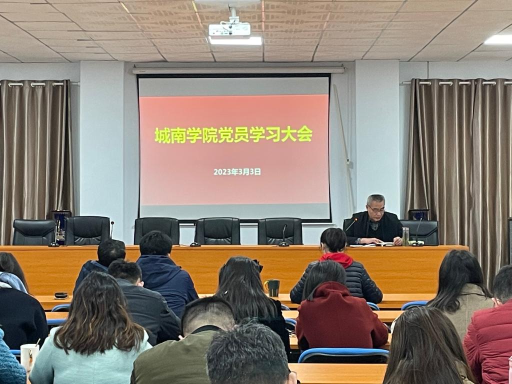 3月3日上午,城南学院党委在金盆岭2教201召开全体教工党员大会,集中学习《中国共产党章程》,学院党委书记李修春领学。