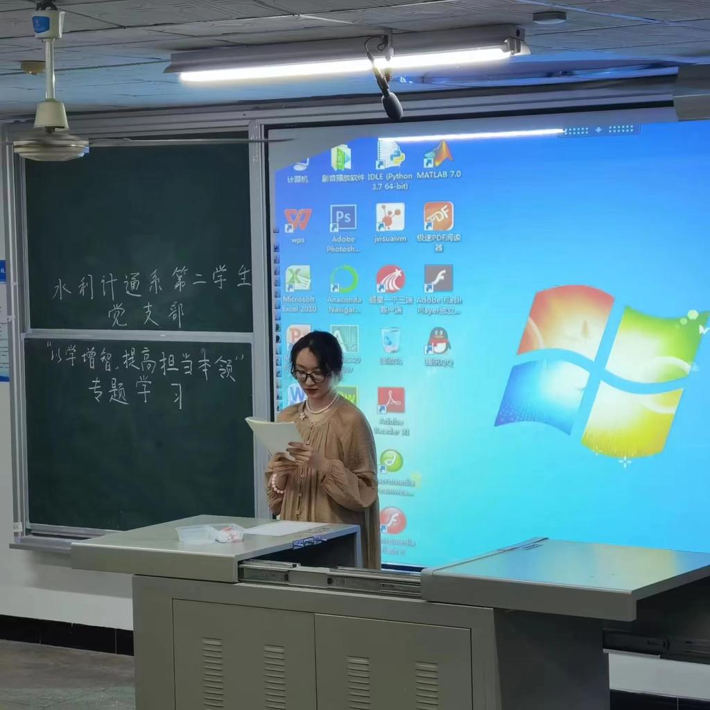 为深入学习贯彻习近平新时代中国特色社会主义思想主题教育和党的二十大精神,推动“一课一片一实践”走深走实,5月26日晚,水利计通系党总支组织各支部党员在12教210、214教室开展了“以学增智,提高担当本领”专题学习。通过观看视频、讨论交流、总结发言环节进行专题学习,不断从习近平新时代中国特色社会主义思想中汲取奋发进取的智慧和力量,树立正确远大志向,坚定理想信念,提高能力本领。
