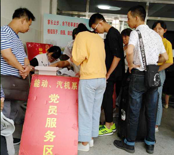 在忙碌的迎新现场,党员志愿者为新同学提供相关咨询,发放免费的矿泉水,引导新同学办理入学相关手续;帮他们搬行李物品,带领他们购买生活用品,熟悉校园环境。他们主动分享自己的大学心得,介绍学院的办学特色及理念,帮助学弟学妹熟悉学习和生活环境,为2018级新同学今后的大学生活打下良好基础。广大新生及家长感受到了城南大家庭的热情和温暖,都为学生党员的热情服务所打动。醒目的“党员示范岗”成为了迎新现场一道亮丽的风景线。