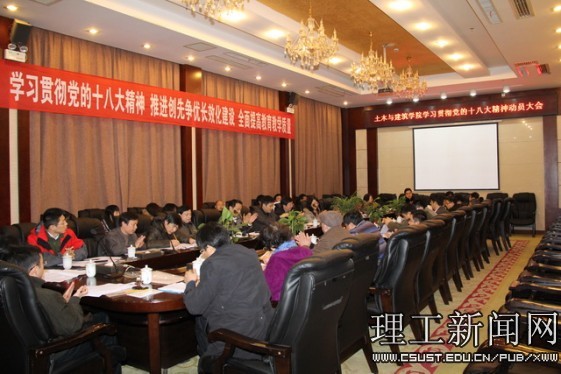 12月15日,土木与建筑学院召开“学习贯彻党的十八大精神,推进创先争优长效化建设,全面提高教育教学质量”动员大会。副校长付宏渊,学院教学督导团徐望华、聂磊、费乐老师,院党委书记陈若玲、院长刘扬,其他院领导及学院全体系(室)主任,教工支部书记参加会议。会议由院党委副书记施一满主持。