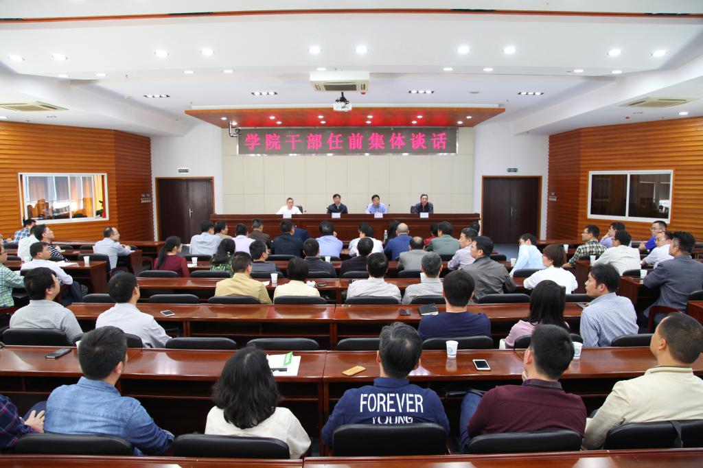 教学学院行政班子换届工作已经全面完成,4月19日上午,学校在九楼会议室开展了学院干部任前集体谈话。部分教学学院院长、全体教学学院副院长,共计70余人参加谈话。校党委书记付宏渊、副书记邹宏如、纪委书记胡永乐出席会议并进行任前谈话。会议由邹宏如主持。