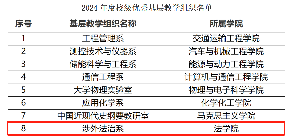近日,经专家多轮评审云顶国际vip8866评选出8个校级优秀基层教学组织,我院涉外法治系荣获2024年度校级优秀基层教学组织称号。