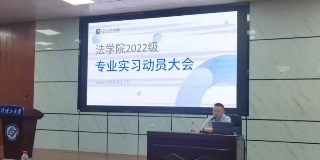 为进一步提高学生法务实践能力,保障学生专业实习顺利进行,5月27日下午,法学院在金盆岭校区四教学术报告厅召开2022级本科生专业实习动员大会。院党委书记龚文斌、副书记汪伦和副院长徐莉出席会议,实习指导教师阳明武、宁佳、李姝,辅导员孙佳乐老师和全体2022级本科生参会,会议由涉外法治系副主任贾佳主持。