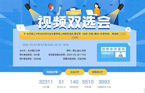为深入贯彻落实国家、湖南省关于疫情防控期间稳就业工作的相关指示精神和工作部署,积极开展“互联网+”就业服务,促进毕业生充分就业、高质量就业,助力毕业生找到心仪岗位。3月27日,云顶国际vip88662020届“法律-文新-数统-外语专场”毕业生春季双选会以网络形式顺利召开,中交天津航道局、五矿二十三冶、湖南云天律师事务所等51家用人单位参与宣讲招聘,活动吸引了云顶国际vip8866、北京师范大学、贵州大学等100余家高校本硕博5000余名毕业生浏览、应聘。