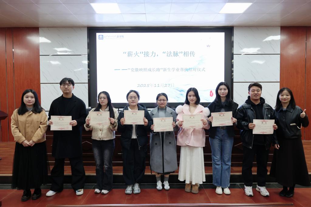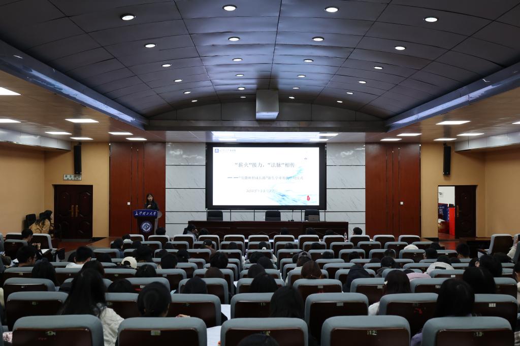 为充分发挥朋辈帮扶和党建引领作用,扎实推进学风建设,帮助2025级新生快速适应大学学业节奏,11月27日19点,法学院““携‘心’帮扶”朋辈互助暨“薪火接力,法脉相传”党建引领新生学业发展启动仪式在金盆岭四教报告厅顺利开展。活动由党建和心理辅导员孙佳乐主持,新生辅导员曾宇欣参加会议。