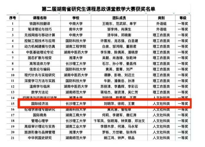 8月26日,第二届湖南省研究生课程思政课堂教学大赛决赛在湖南科技大学举行,我院刘明萍老师团队以国际经济法为参赛课程,经过初赛、复赛、决赛的层层角逐,荣获人文社科类一等奖。