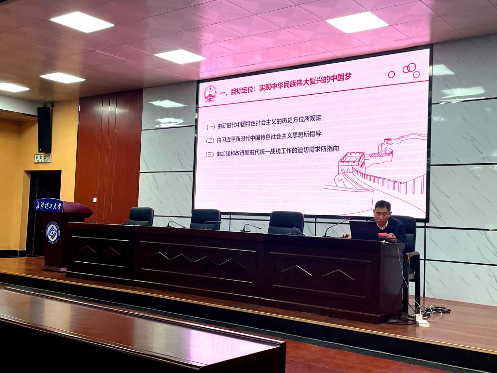 田兴洪作题为《学习贯彻习近平总书记关于加强和改进统一战线工作的重要论述,为促进法学院更快更好发展绘画出更大更美同心圆》的导学辅导报告,从“目标定位:实现中华民族伟大复兴的中国梦”“理论主题:最广泛地争取人心和力量”“主体框架:从统一战线关系、制度、思维三个维度服务中华民族伟大复兴”“主要范畴:实现中华民族伟大复兴中国梦的实践要求”四个方面谈了如何从理论层面认识和把握习近平总书记关于加强和改进统一战线工作的重要论述的深刻内涵的学习体会。田兴洪指出,党的十八大以来,以习近平同志为核心的党中央高度重视统一战线工作,习近平总书记就如何做好新时代统战工作发表了一系列重要论述,就加强和改进统一战线工作提出了一系列新理念新思想新战略,科学回答了需不需要统一战线、需要什么样的统一战线、怎样巩固和发展统一战线等重大问题,实现了党的统一战线理论的重大创新。习近平总书记关于加强和改进统一战线工作的重要论述是习近平新时代中国特色社会主义思想的重要组成部分,是新时代巩固和发展最广泛爱国统一战线的根本遵循。