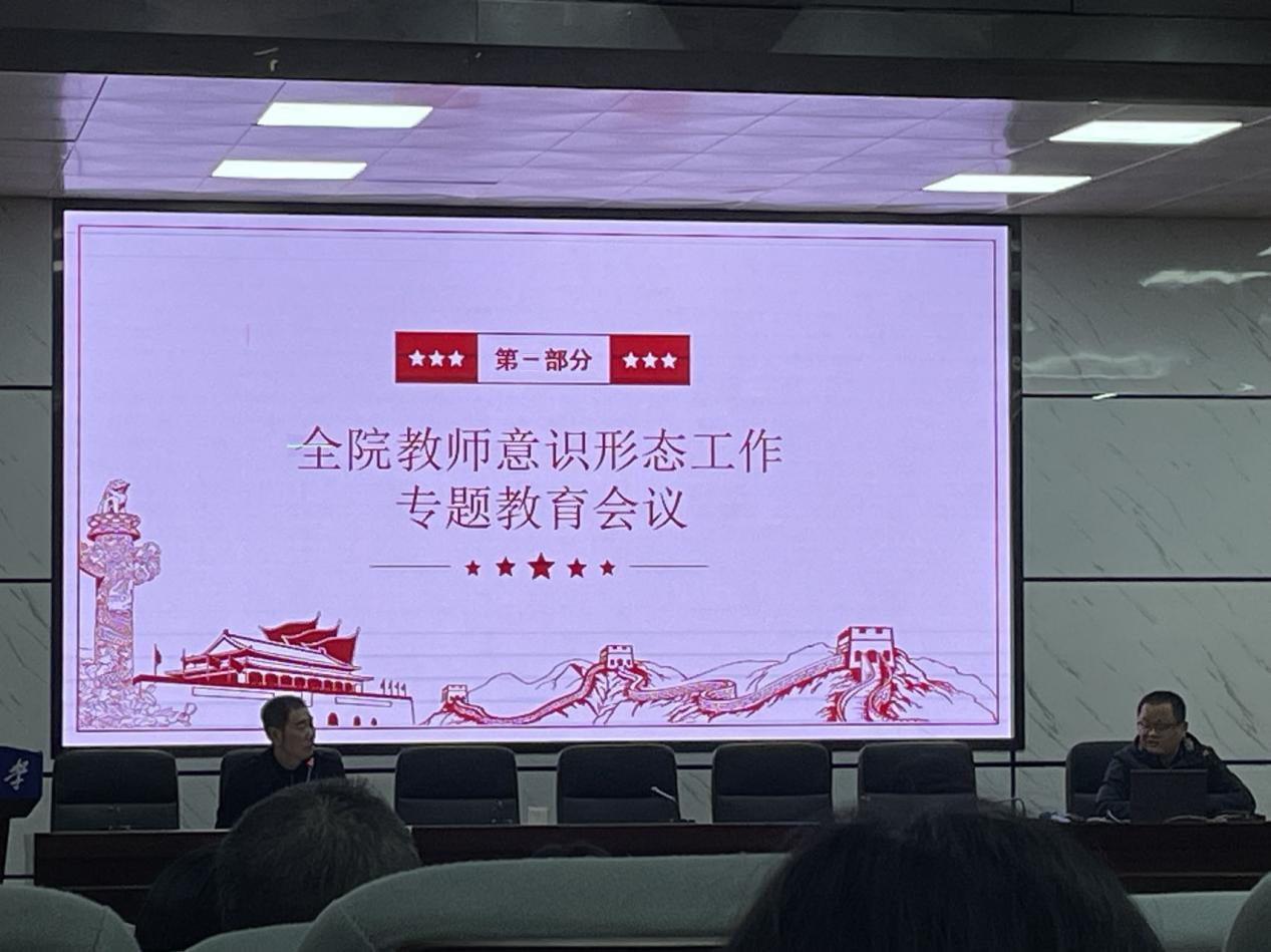 首先,进行全院教师意识形态工作专题教育会议。田兴洪做了题为《扎实推进意识形态工作,促进学院内涵建设和高质量发展在上新台阶》的主题发言,他阐述了意识形态工作的概念、挑战及对策,并通报了我院意识形态工作方面存在的薄弱环节及整改情况。学院党总支副书记、副院长汪功伟、学院党总支宣传委员易顶强对我院师生意识形态工作情况进行了通报。