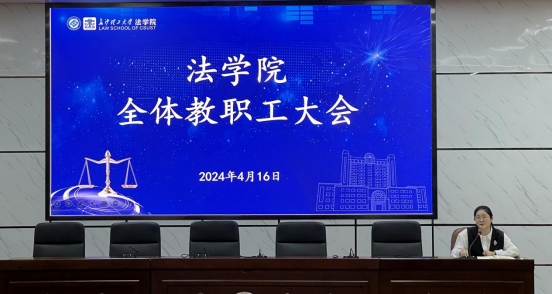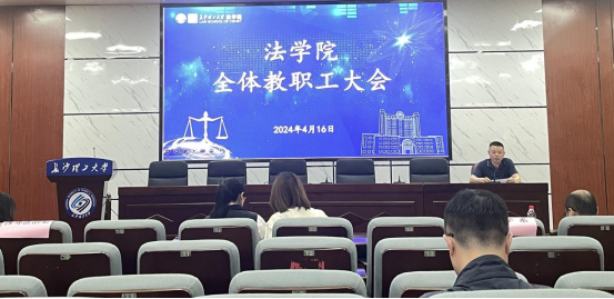 4月16日下午,法学院在金盆岭校区四号教学楼1楼学术报告厅召开本学期第三次全体教职工大会,全院教职工参加会议。