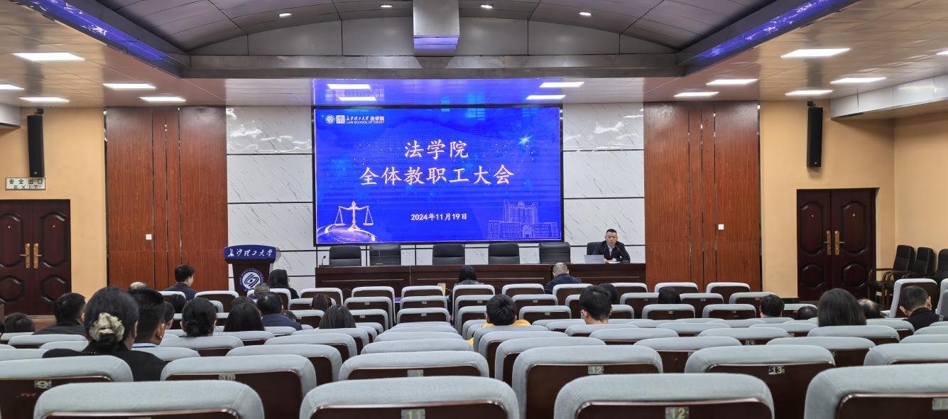 11月19日下午,法学院在金盆岭校区四号教学楼1楼学术报告厅召开本学期第二次全体教职工大会,会议由党委书记龚文斌主持,全院教职工参加会议。