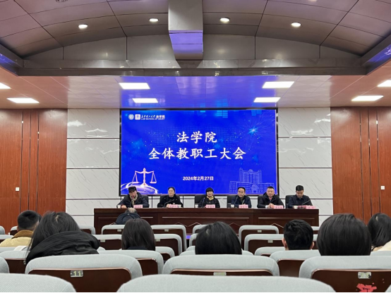 2月27日,法学院在金盆岭校区四教学楼1楼学术报告厅召开干部任职宣布暨新学期工作布置会议,校党委委员、副校长蒋璟萍,统战部常务副部长黄自力出席会议,全院教职工参加会议,会议由张敏纯院长主持。