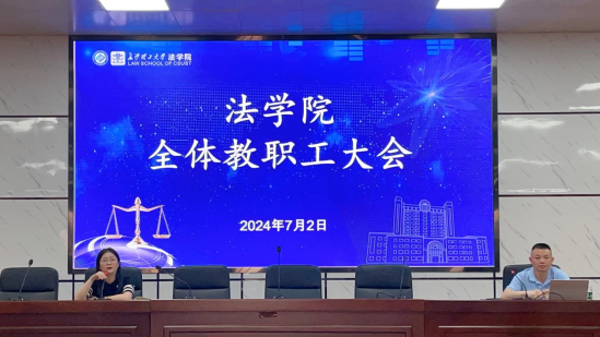 7月2日下午,法学院在金盆岭校区四号教学楼1楼学术报告厅召开本学期第六次全体教职工大会,会议由院党委书记龚文斌主持,全院教职工参加会议。