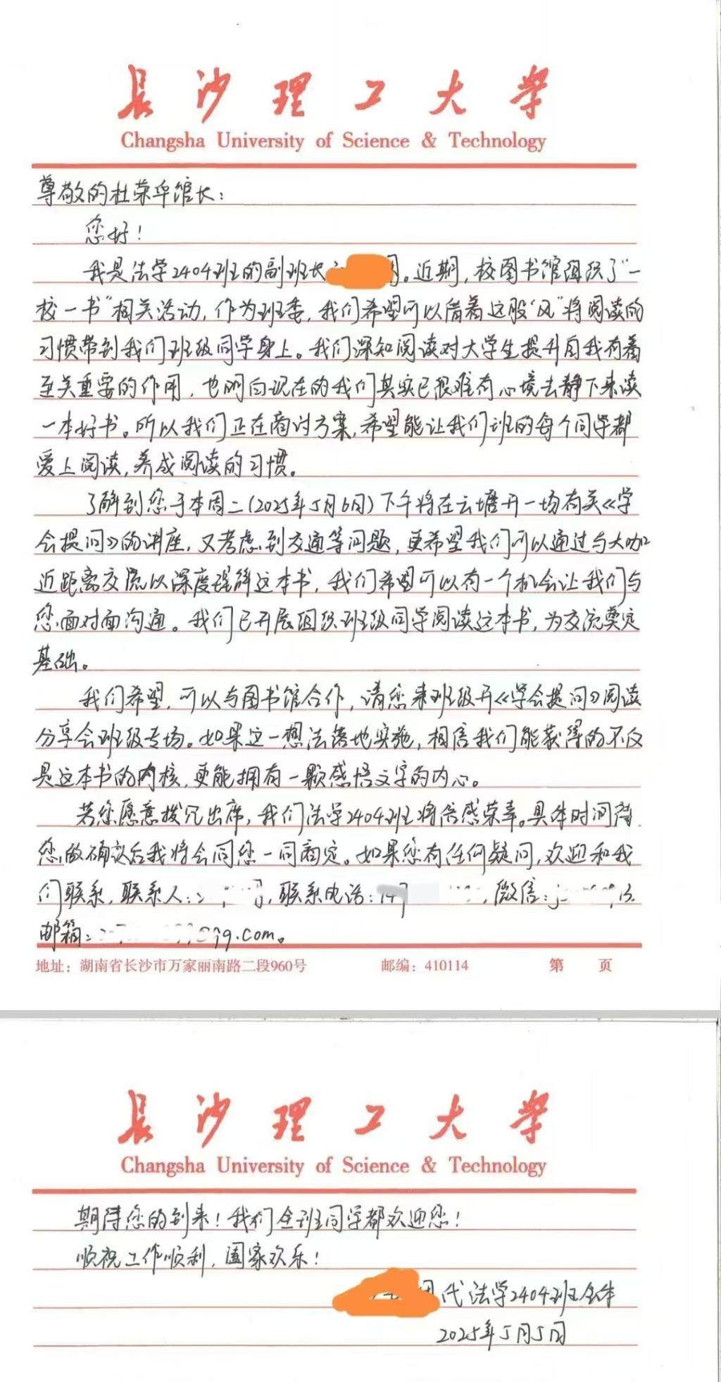 5月5日,云顶国际vip8866图书馆馆长杜荣华教授收到一封特别的邀请信,法学2404班的班干部代表全班同学向杜馆长发出了参加班级读书分享会的邀约。