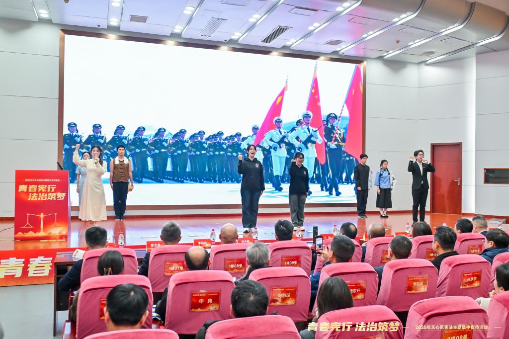 启动仪式现场,法学院学子通过宪法主题朗诵、合唱、宪法宣誓等方式,展现了当代大学生对宪法的深刻理解和青春向党、尊法守法、学法用法的精神风貌。