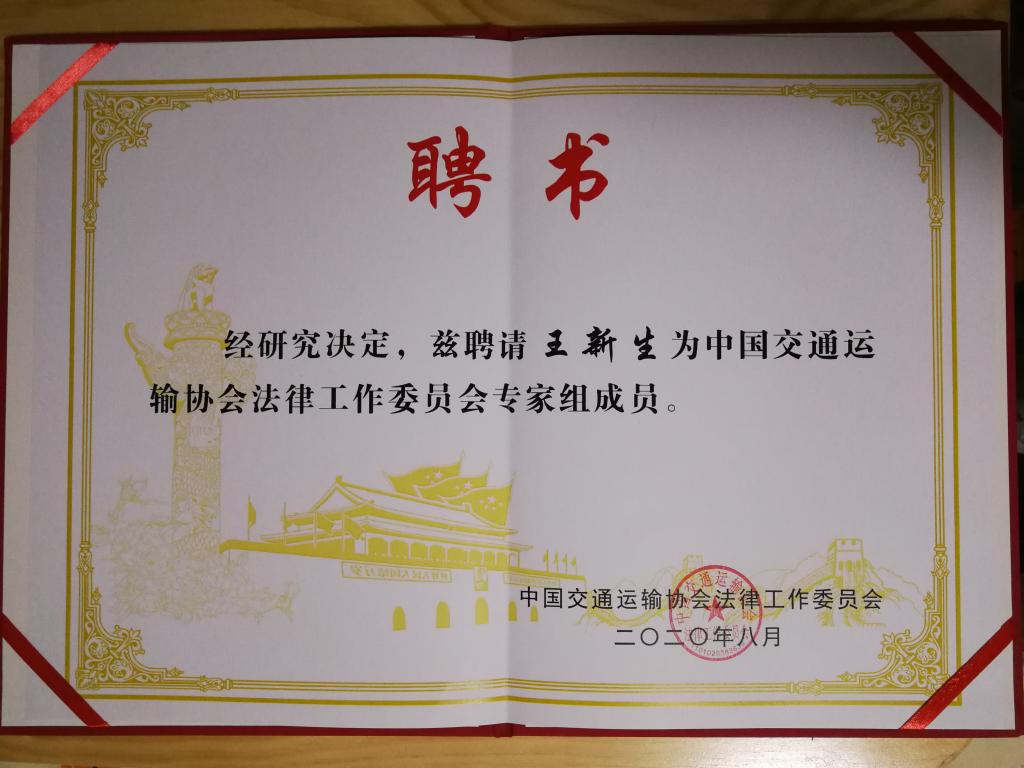 专家组成立大会通过了《中国交通协会法律工作委员会专家组工作规则》,并向受聘专家颁发了聘书。我系工程法学研究中心主任王新生教授受聘了专家组成员。这说明我系工程法学经过多年的发展,影响力日益扩展,得到了中国交通运输行业的高度认可。