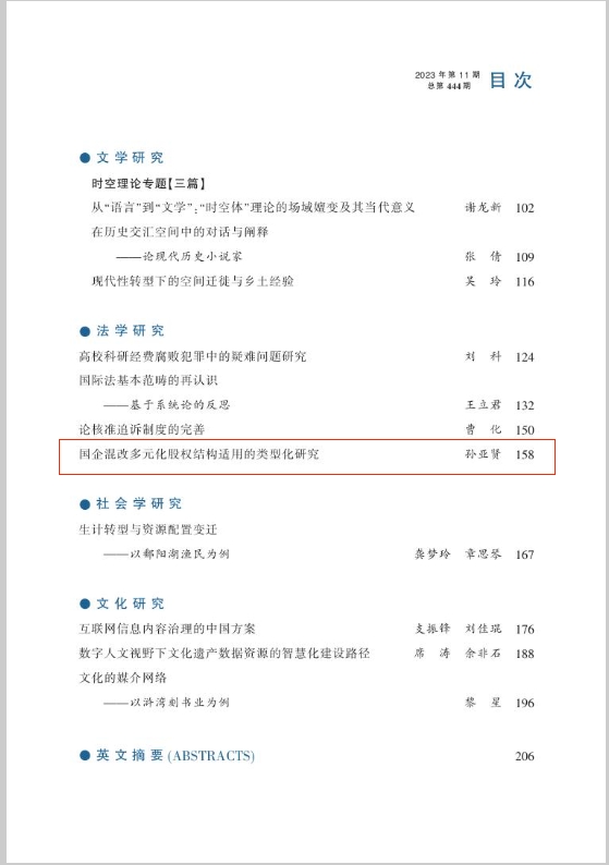 近日,云顶国际vip8866法学院讲师孙亚贤在《江西社会科学》(CSSCI来源期刊)2023年第11期发表论文《国企混改多元化股权结构适用的类型化研究》。