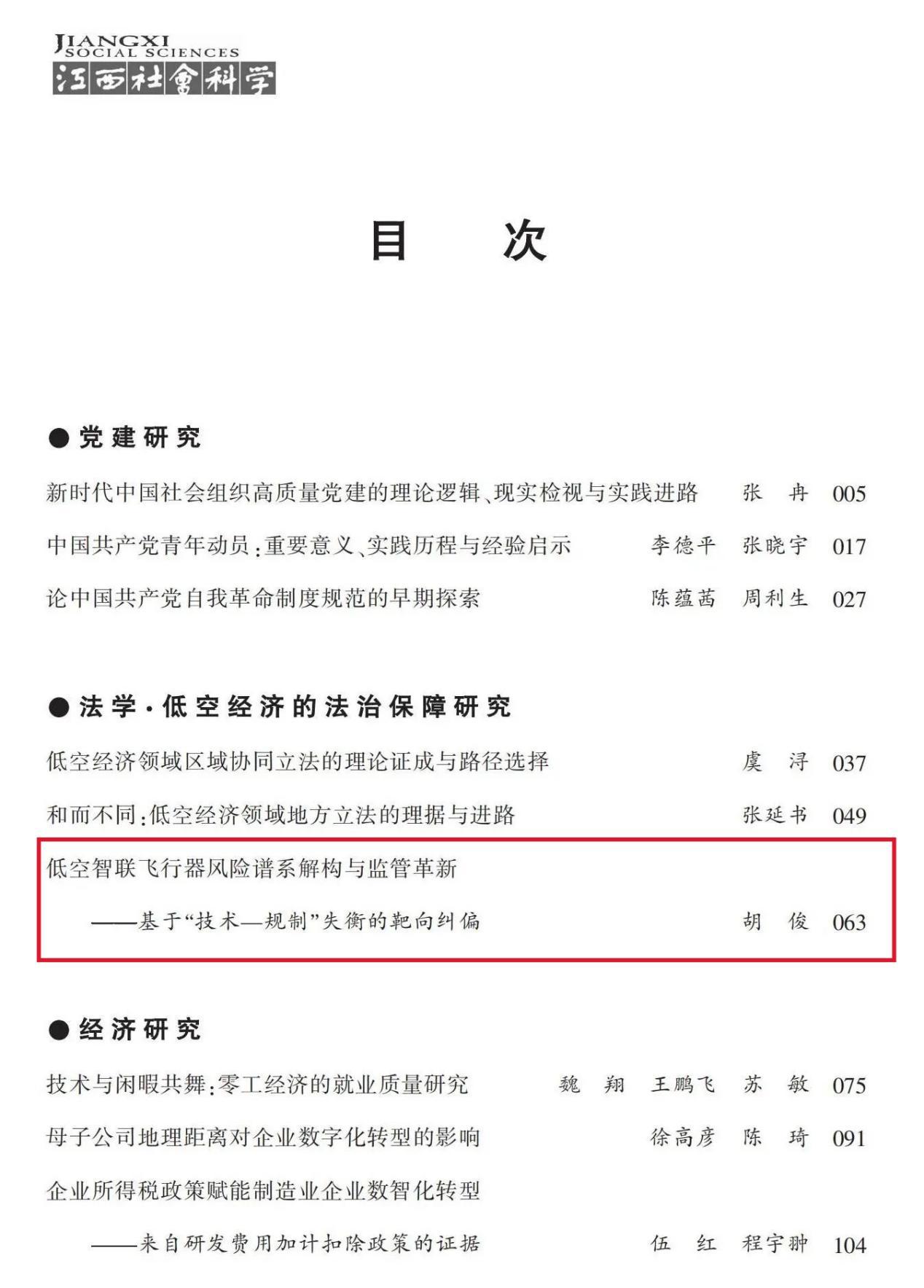 近日,云顶国际vip8866法学院讲师胡俊在《江西社会科学》2025年第5期发表论文《低空智联飞行器风险谱系解构与监管革新—基于“技术—规制”失衡的靶向纠偏》。