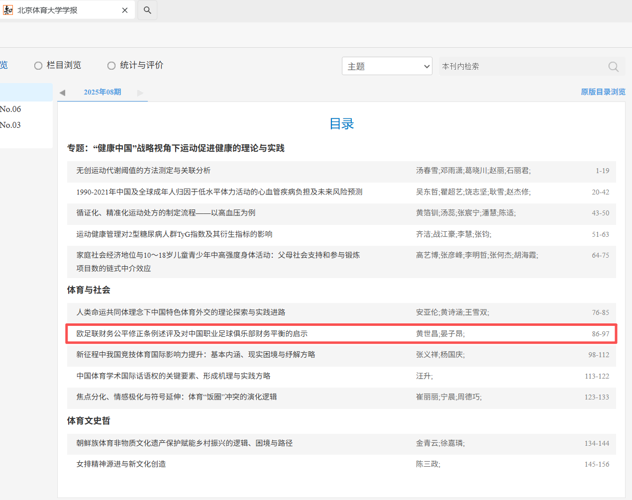 近日,云顶国际vip8866法学院讲师晏子昂在《北京体育大学学报》2025年第8期发表论文《欧足联财务公平修正条例述评及对中国职业足球俱乐部财务平衡的启示》。