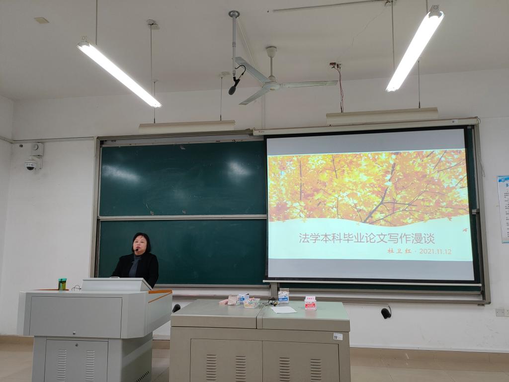 11月12日上午9:00,法学院在文科楼A307举办《法学本科毕业论文写作漫谈》讲座,本次讲座由法学院党委委员、教学指导委员会副主任杜卫红老师主讲,法学院2018级本科生、2020级第二学士学位学生参加了讲座。