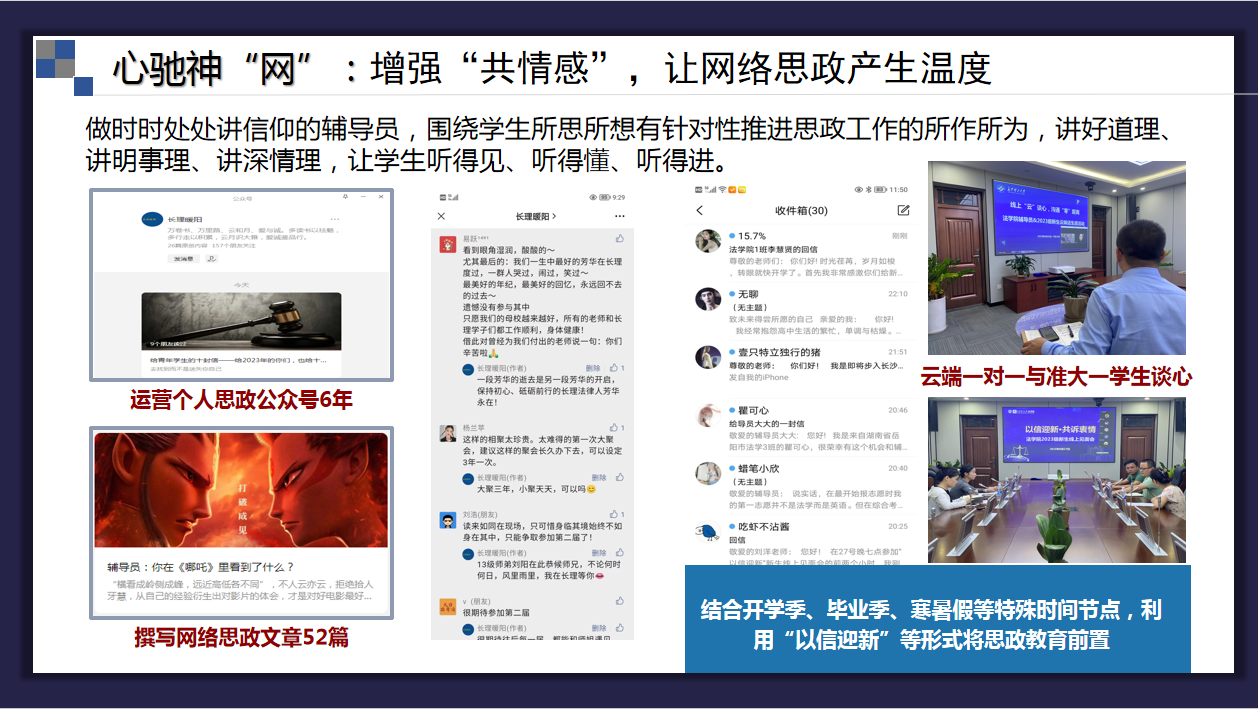 因为追求共情感,他所运营的公众号就叫“长理暖阳”;所以60余篇网络思政文章均聚焦学生理想信念、学习生活等息息相关的身边事;所以疫情期间策划的线上校友跨届聚会回忆版网文,引发了广大校友在留言区深情评论;所以在一些特殊的时间节点,家长和学生总能收到来自辅导员的唠叨;所以他坚持三年以“信”迎新以及今年全新上线的云端“一对一”准大学生谈心活动受到家长学生一致好评。