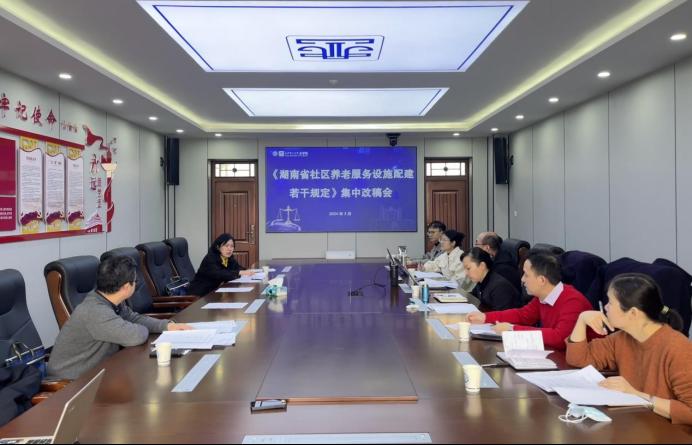 3月7日上午,湖南省司法厅立法一处处长彭荣卫、副处长肖祥沛,省人大社会委办公室三级调研员成蔚,省民政厅养老服务处处长叶建之、副处长吴舟等领导莅临我院,就《湖南省社区养老服务设施配建若干规定(草案修改稿)》条文修订展开研讨。我院副院长申纯、尹迪老师等项目团队成员参与会议,改稿会于四号教学楼313会议室举行。
