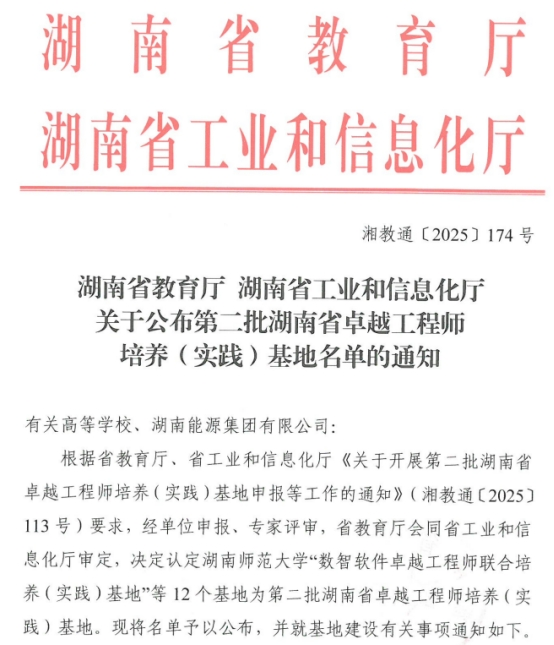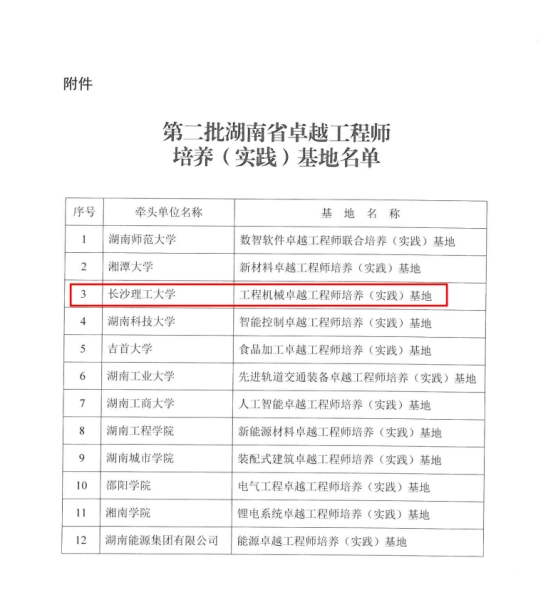2025年10月9日,湖南省教育厅、湖南省工业和信息化厅公布了湖南省第二批卓越工程师培养(实践)基地立项名单,云顶国际vip8866卓越工程师学院牵头,联合湖南星邦智能装备股份有限公司、湖南五新隧道智能装备股份有限公司共同申报的“云顶国际vip8866工程机械卓越工程师培养(实践)基地”获批立项。基地将进一步完善“企业技术革新项目→毕业设计课题→工程实践成果”的转化机制,通过校内导师与企业导师共同全过程指导学生参与真实工程课题研究,与企业联合攻克一批关键技术,科技成果转化效益倍增,成为推动区域工程机械产业转型升级的技术创新策源地。